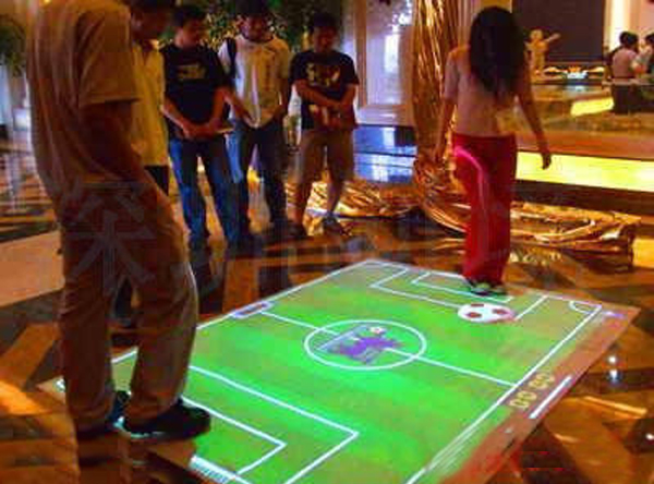 “魔幻地面”(MAGIC FLOOR)的运作原理首先是通过捕捉设备(感应器)对目标影像(如参与者)进行捕捉拍摄,然后由影像分析系统分析,从而产生被捕捉物体的动作,该动作数据结合实时影像互动系统,使参与者与屏幕之间产生紧密结合的互动效果。当观众走过投影仪覆盖的区域时,通过视觉识别系统用投影仪把图形、影像、动画等多媒体互动效果投射到地识别,该观众的动作、行为,可以融入制作好的互动效果画面,并让观众的动作与画面中的制作好的内容进行实时交互,互动画面和声音变幻给参与者模拟了一种与现实不同的氛围,“魔幻地面”(MAGIC FLOOR)是集虚拟仿真技术、图像识别技术于一身的人机互动只能设备,包括水波纹、翻转、碰撞、擦除、避让、跟随等表现形式通过这种互动,可以虚拟一些游戏,如踢足球、摸鱼、下棋等,吸引人气。