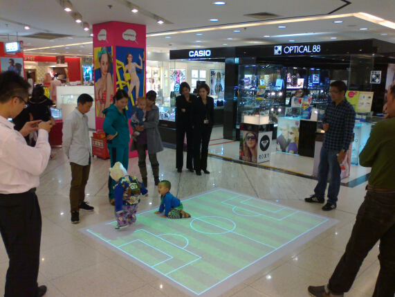 • 魔幻地面”(MAGIC FLOOR)是一个聚积人气的好方式。当观众走过互动区域时,视觉识别系统将识别出其动作,实现人与地上动态画面的实时交互。它包含了非常广泛的应用——可以让你“步行”在水面上,脚下涟漪朵朵,调皮的鱼儿机灵地躲避你的脚步;也可以让花朵盛开,藤蔓跟随你的脚步舒展枝条。魔幻地面”(MAGIC FLOOR)一般运用于大型商场、产品发布会等场合,是有效营造特殊气氛和效果的一种互动产品。
