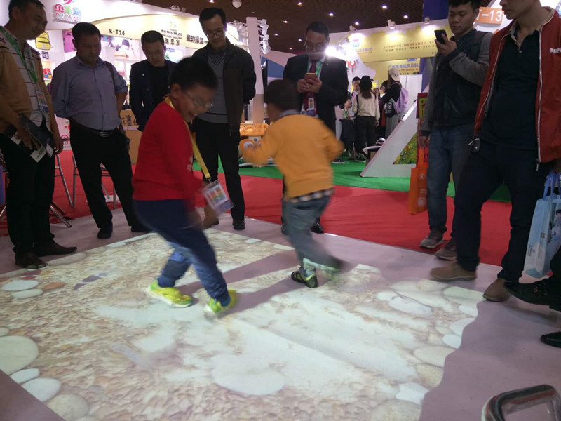 此次,上海豪派做为幼教资源的优秀供应商亮相博览会,美国引进的智能互动教育设备Magic-Floor“魔幻地面”,针对孩子天性爱玩的特征,通过游戏的方式贯穿人机交互的表现形式,设计出符合儿童发展规律的互动游戏,孩子通过肢体动作与投影画面产生愉快互动,从而刺激感官,运动肢体,开发孩子潜能,启发兴趣,更好的学习知识