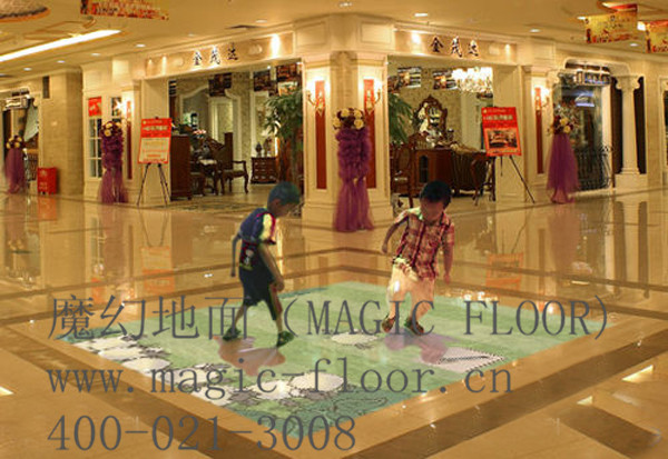 “魔幻地面”(MAGIC FLOOR)采用悬挂在顶部的投影设备把影像效果投射到地面,当使用者走至投影区域时,通过系统识别,使用者可以直接使用双脚或动作与投影幕上的虚拟场景进行交互,互动效果就会随着你的脚步产生相应的变幻。