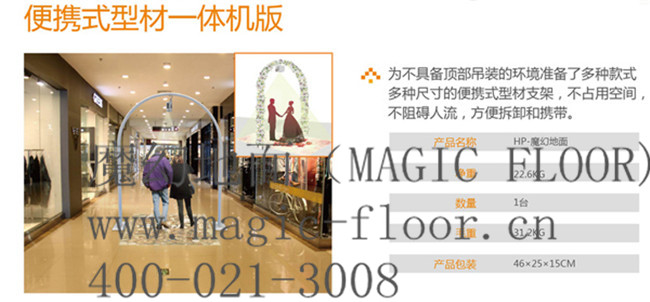 “魔幻地面”(MAGIC FLOOR)的便携式机体因为占用空间小,重量轻可以安装到各个场所、空间,那就是说可以根据客户的需要转移安装场地,随插随用,方便快捷。